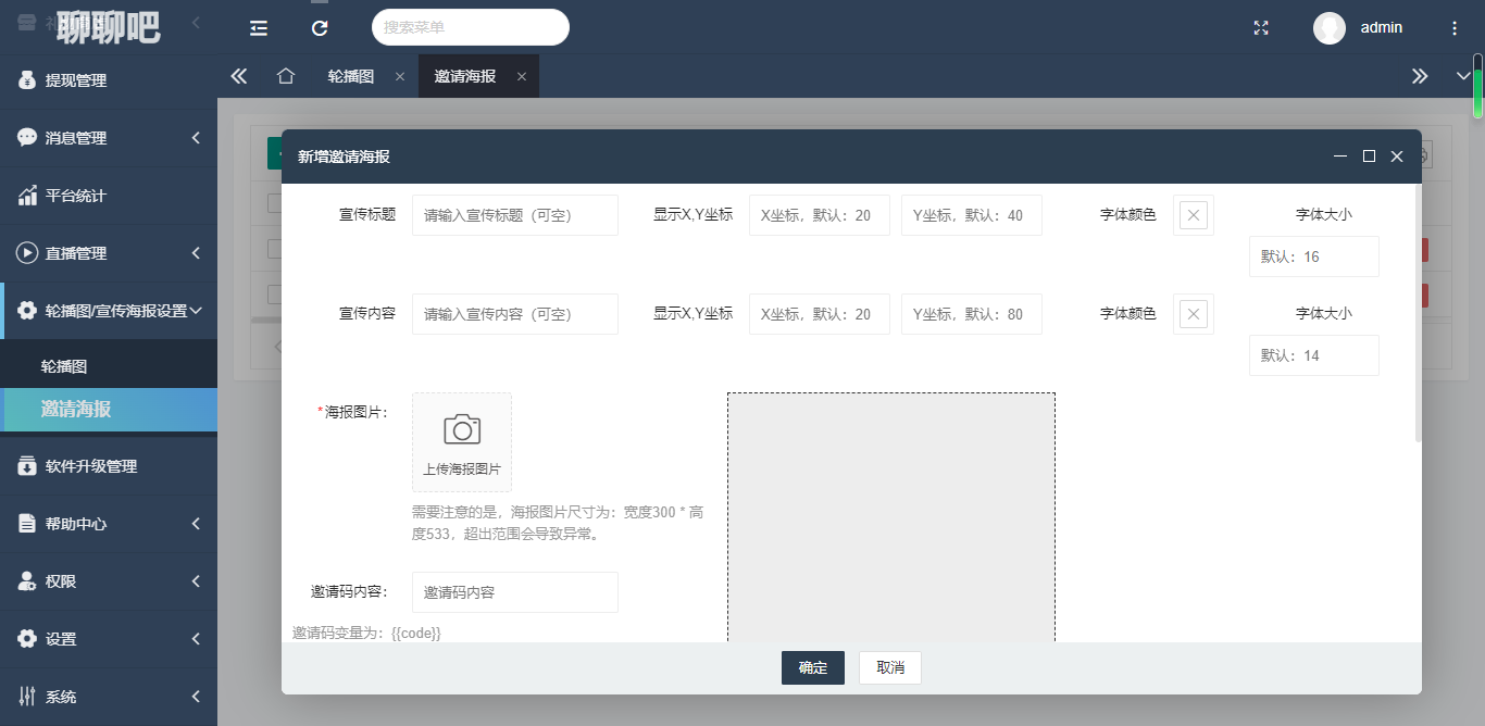 海报图支持:宣传标题、宣传内容、邀请码、底图设置。