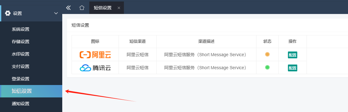 5.短信配置,不配置短信无法进行注册和验证码登录。按自己需要选择服务商。
