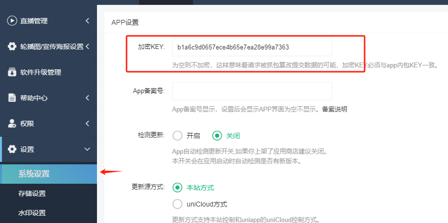 配置必要的请求加密KEY,这个KEY是自己手动填写的,建议随机生成md5或has1值。填写完成后需要在uinapp代码config.js更改。