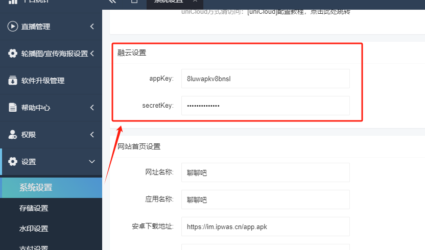 2.配置融云appkey和secretKey。这需要前往融云创建(https://www.rongcloud.cn/),同时也还需要在uniapp中config.js中修改appKey