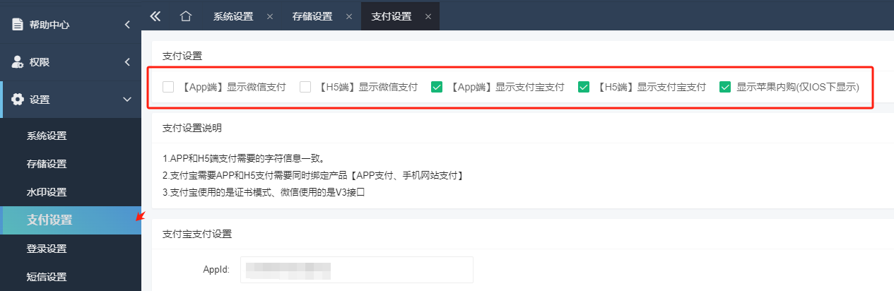 4.支付设置需要自行前往微信支付、支付宝支付、苹果开发者中心申请内购ID(内购ID在充值列表产品中设置)。