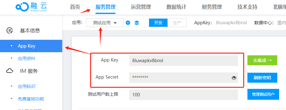 2.配置融云appkey和secretKey。这需要前往融云创建(https://www.rongcloud.cn/),同时也还需要在uniapp中config.js中修改appKey